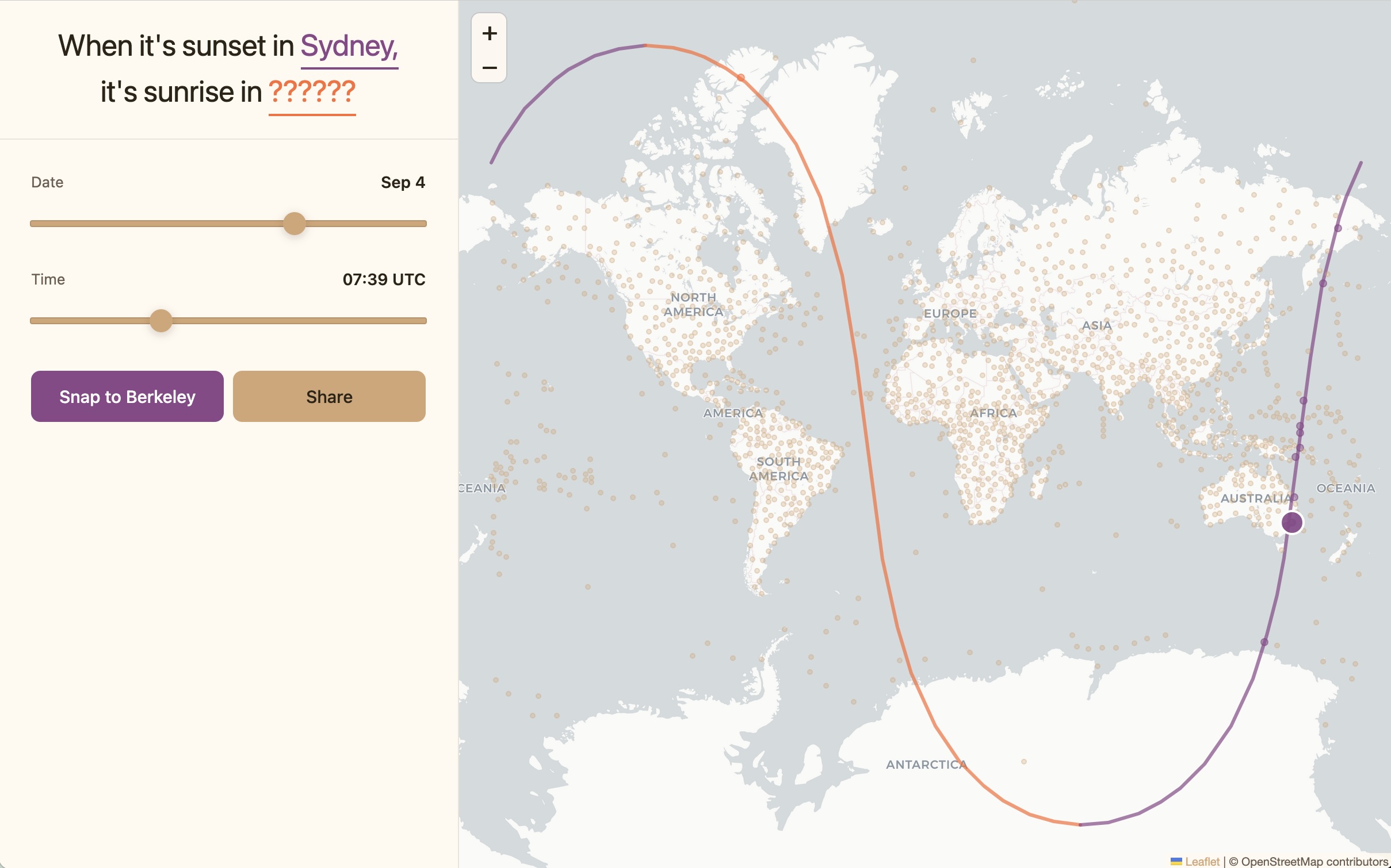 When it's sunset in San Francisco, it's sunrise in Bhutan. In June, it's sunrise in Amsterdam instead. The pairing changes every day, tracing an arc across the globe as the seasons shift.