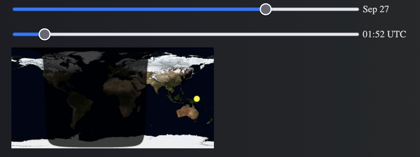 Sticking with just large-ish towns, airports, and seamounts, I came up with a list of 50,000 points that cover most of the planet. And indeed, on that day when it's sunset in Sydney, it's sunrise at Corvo Airport in the Azores and Tanquary Fiord Airport in Nunavut, Canada.