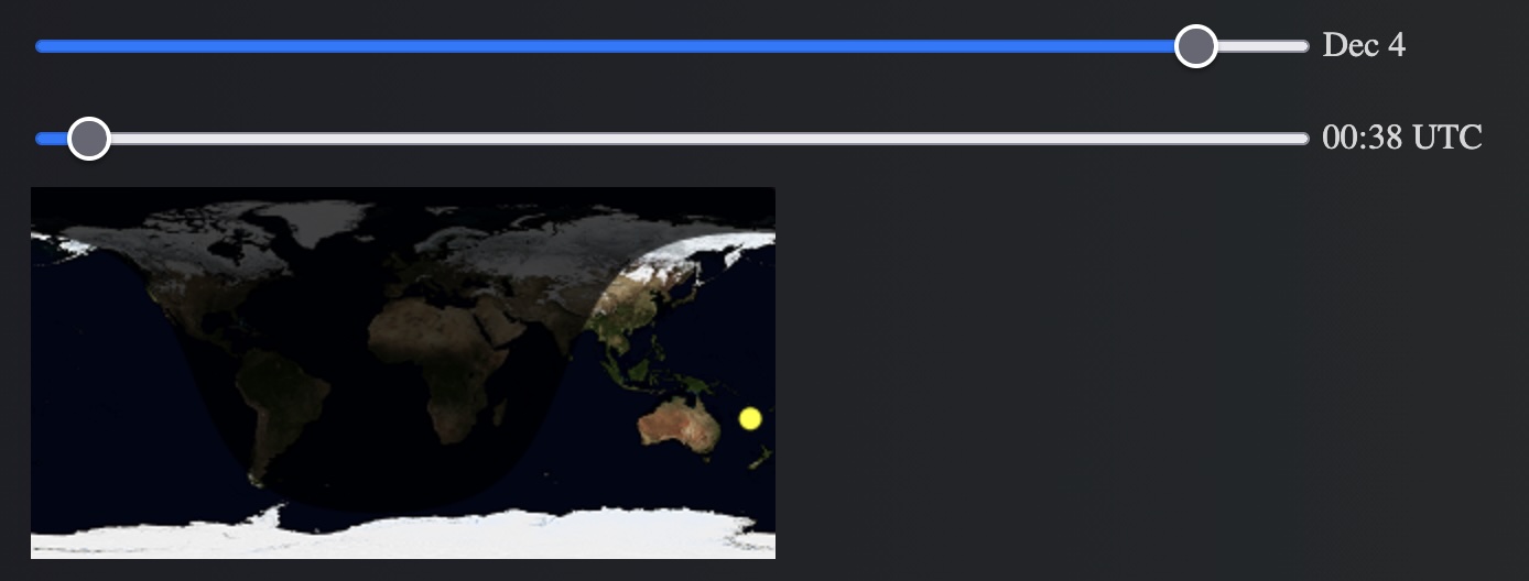 The map on CelestialProgramming.com plots a line showing the edge of sunlight, which the world calls a terminator line. On December 4, I could move the time slider to approximately where the sun is setting in California. Then I could look at the arc of where the dark transitioned to lightness and see that it was rising ... somewhere in Bangladesh? And I guess also somewhere in China and Eastern Russia?